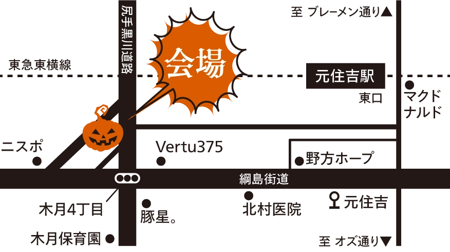 「木月4丁目」交差点を右折してすぐ、ハロウィン装飾のある建物がめじるしです。