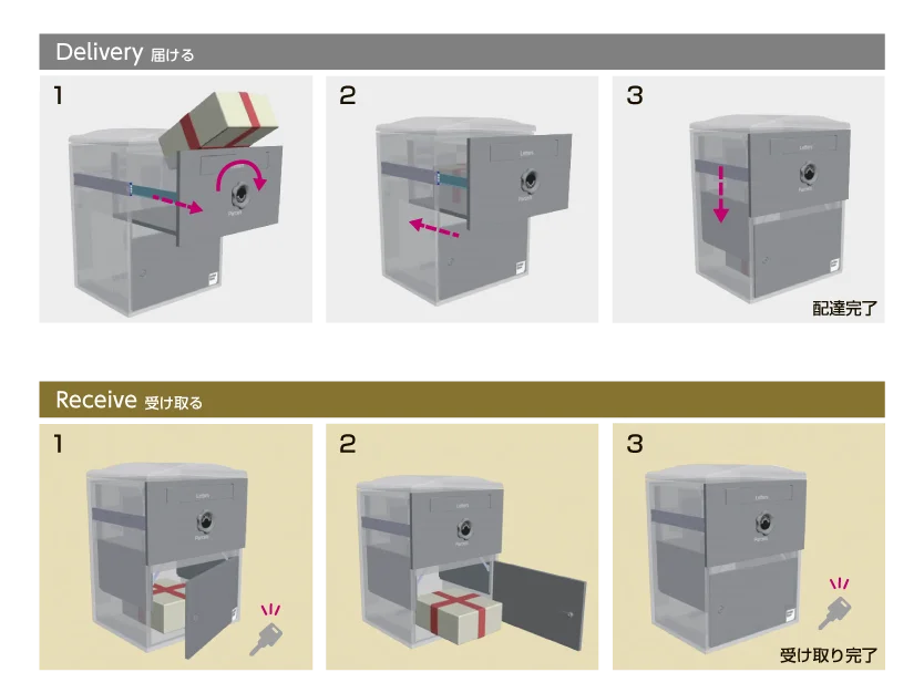4.いつでも・何度でも受け取れる:1日に複数回の配達が来ても、保管容量いっぱいまで受け取れます。通販や定期便が多いご家庭にも安心です。