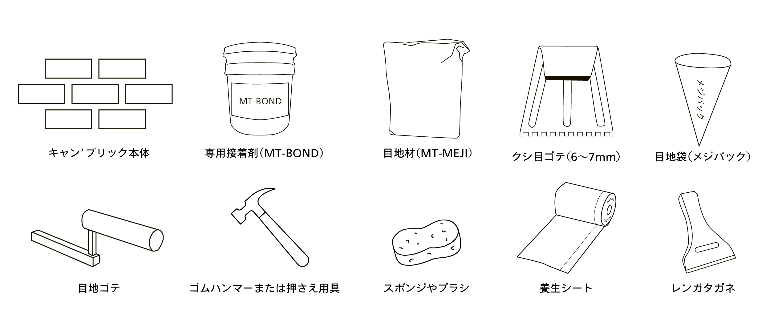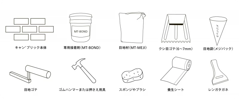 初心者の方には、接着剤や目地材が小分けになった「DIYセット for CAN’BRICK」がおすすめです。 約1㎡の施工が可能で、割り付け方法や張り方を解説したマニュアルも付属しています。