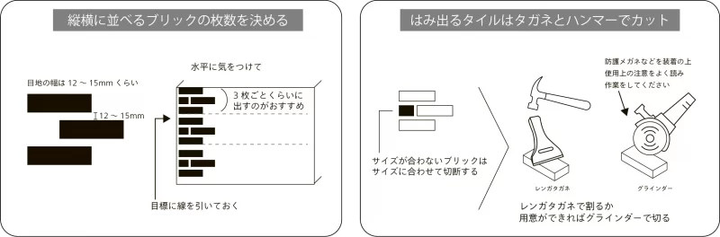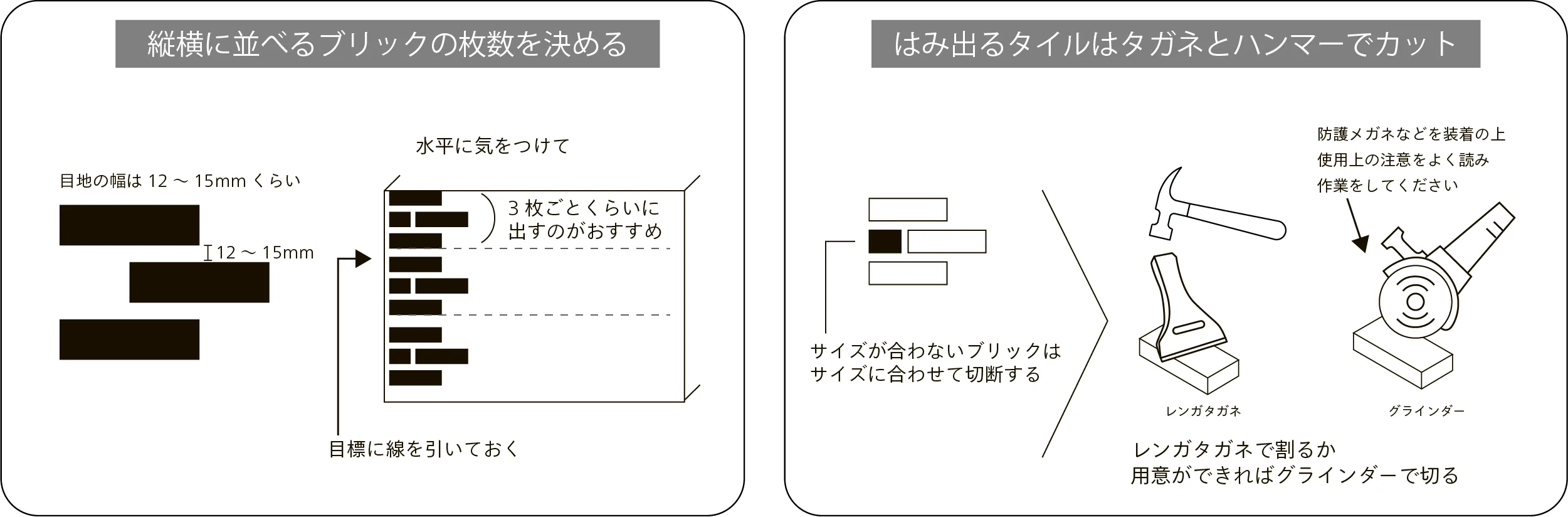 施工箇所の面積を測り、縦横に並べるブリックの枚数を決めます。目地幅は12〜13mmほどを目安にして下さい。施工箇所からはみ出るブリックは線状に傷をつけ、タガネとハンマーでカットして下さい。
