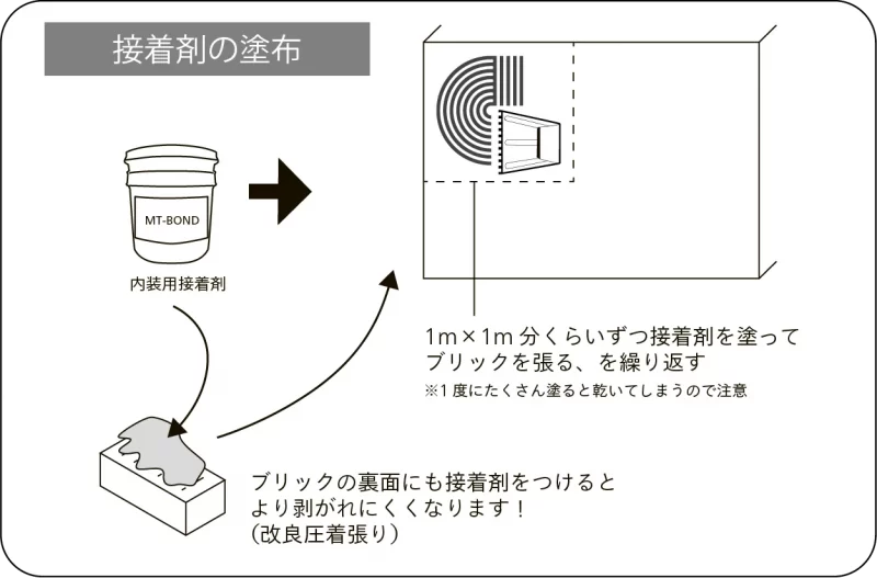 専用接着剤(MT-BOND)をクシ目ゴテで下地に塗り付け、クシ目をつぶして3〜5mm程度の塗り厚に調整します。一度に塗る面積は、オープンタイム約40分以内にブリックを張り終える面積、または1㎡以内に留めます。