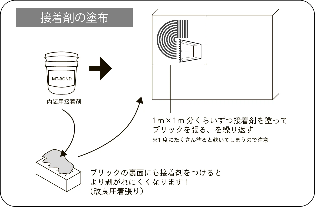 ブリックの裏面にMT-BONDを塗り、もみ込むようにして下地に貼り付けます。目地部にMT-BONDがはみ出すまで、しっかりと押し込んでください。2㎡ごとに数枚剥がし、接着剤の付着状況(70%以上)を確認します。