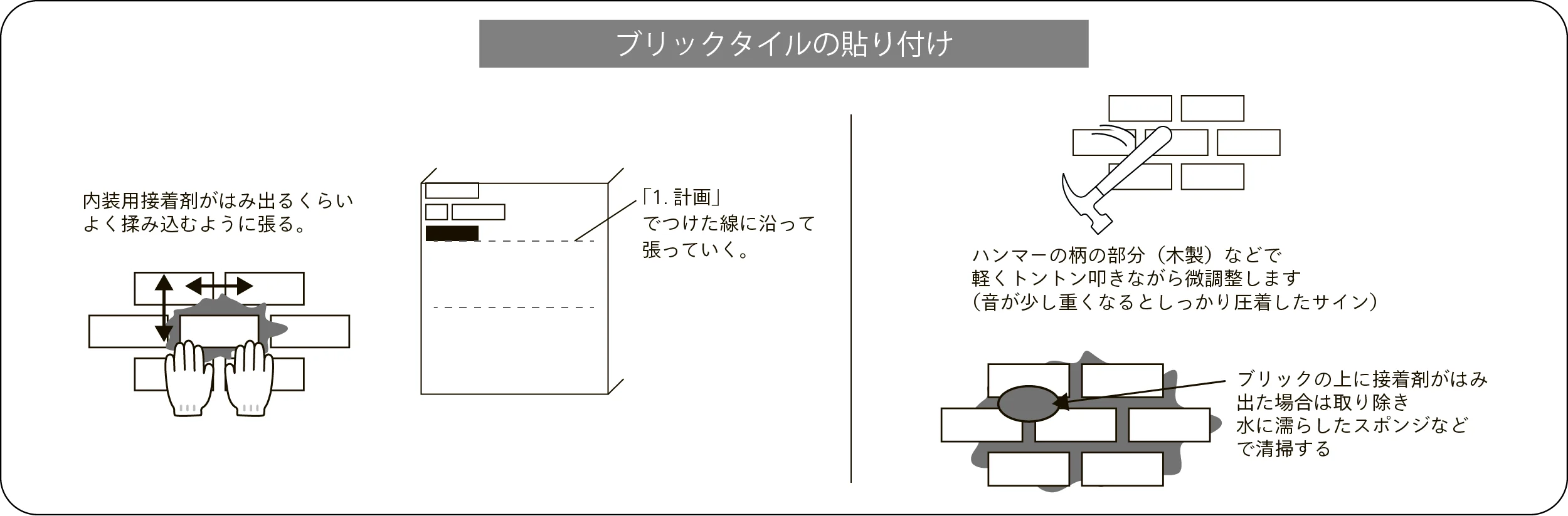 {“@type”:”HowToStep”,”name”:”4. ブリックタイルの貼り付け”,”text”:”裏面に接着剤を塗布し、もみ込むように圧着。”},