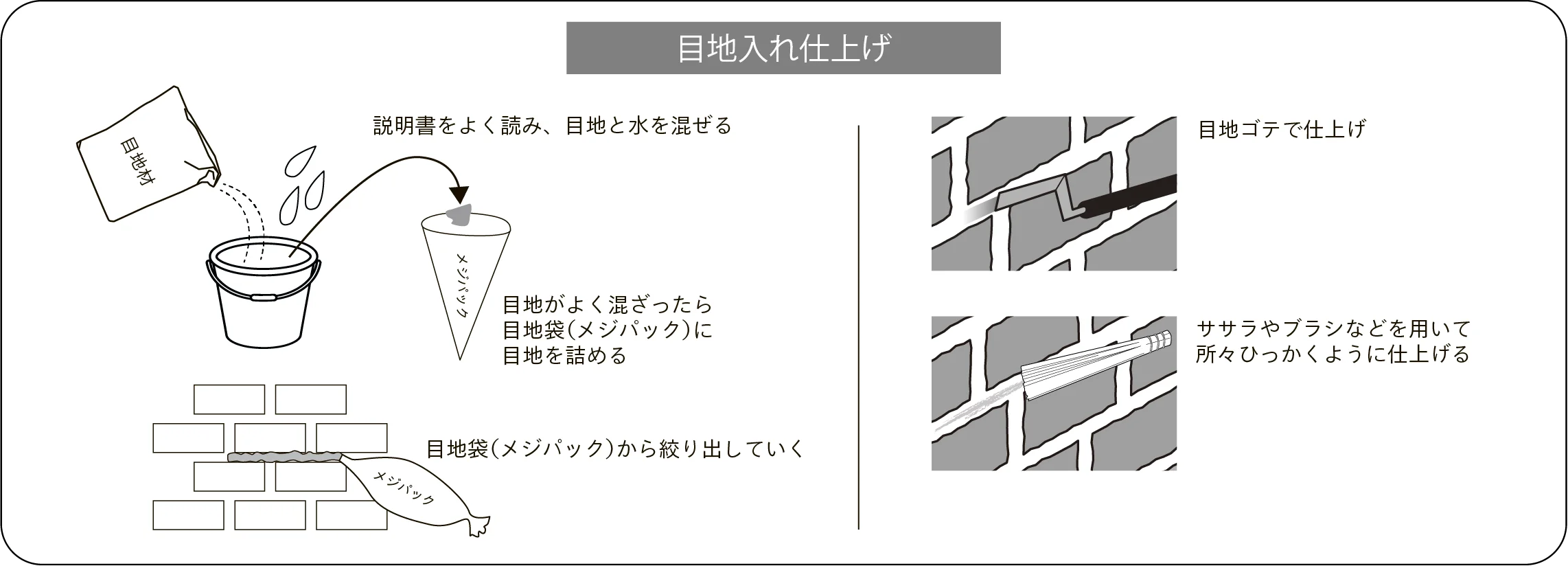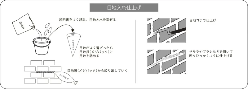 {“@type”:”HowToStep”,”name”:”6. 目地入れ仕上げ”,”text”:”目地袋で充填後、目地ゴテで押さえる。”},